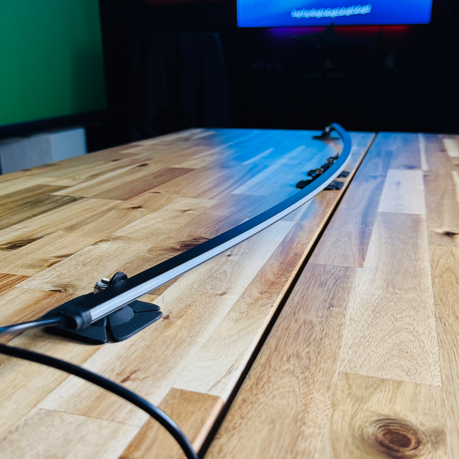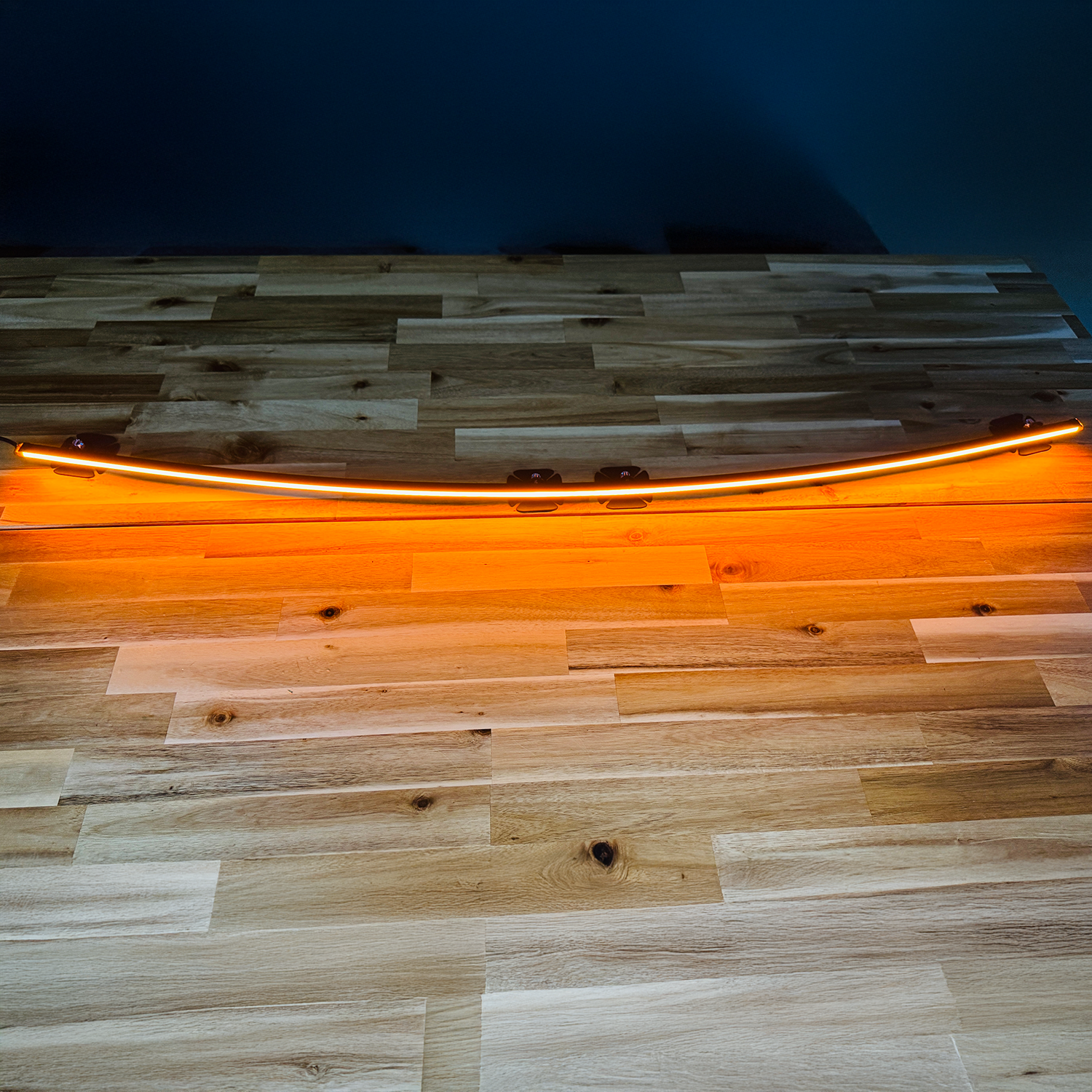 Continuous LED strip produces a smooth, neon-style glow with no visible hotspots or pixelation.