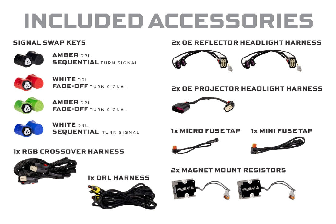 - Accessories : 1x Mini Fuse Tap, 1x Micro Fuse Tap, 1x DRL Harness, 2x Magnet-Mount Resistors, 2x OE Reflector Headlight Harnesses, 2x OE Projector Headlight Harnesses, 1x RGB Crossover Harness, 8x (4 Pairs) DRL / Signal Mode Selectors