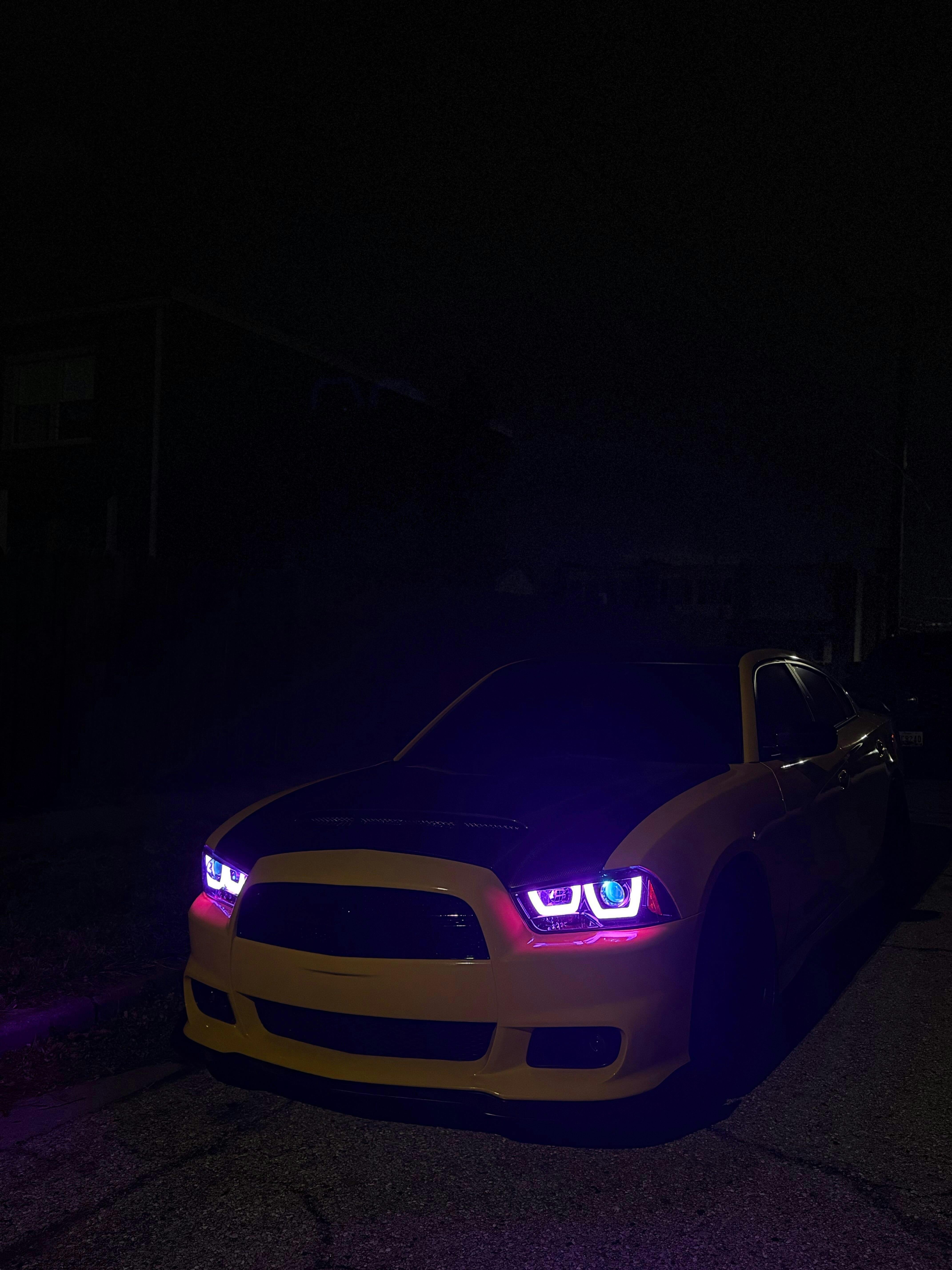 AutoLEDTech.com 's Prebuilt 2011-2014 Dodge Charger Spec-D RGBW Color-Chasing Halo Projector Headlights can change to any solid color, pure white, plus hundreds of moving, flow series patterns! Our prebuilt headlights are your solution to an easy headlight upgrade. These will fit any model 2011-2014 Dodge Charger (SE, SXT, Rallye, RT, SRT8, Super Bee, etc). The original DRL boards are replaced with our custom RGBW Color-Chasing DRL boards that can change to any solid color, PURE white, plus hundreds of moving, color-chasing patterns! Our Sequential Turn Signal/DRL harness can be added to give the DRLs the ability to switch to a sequential amber turn signal as well as a white DRL for driving. Halos can also be installed around the projector if desired. Please contact us if you have any special requests!