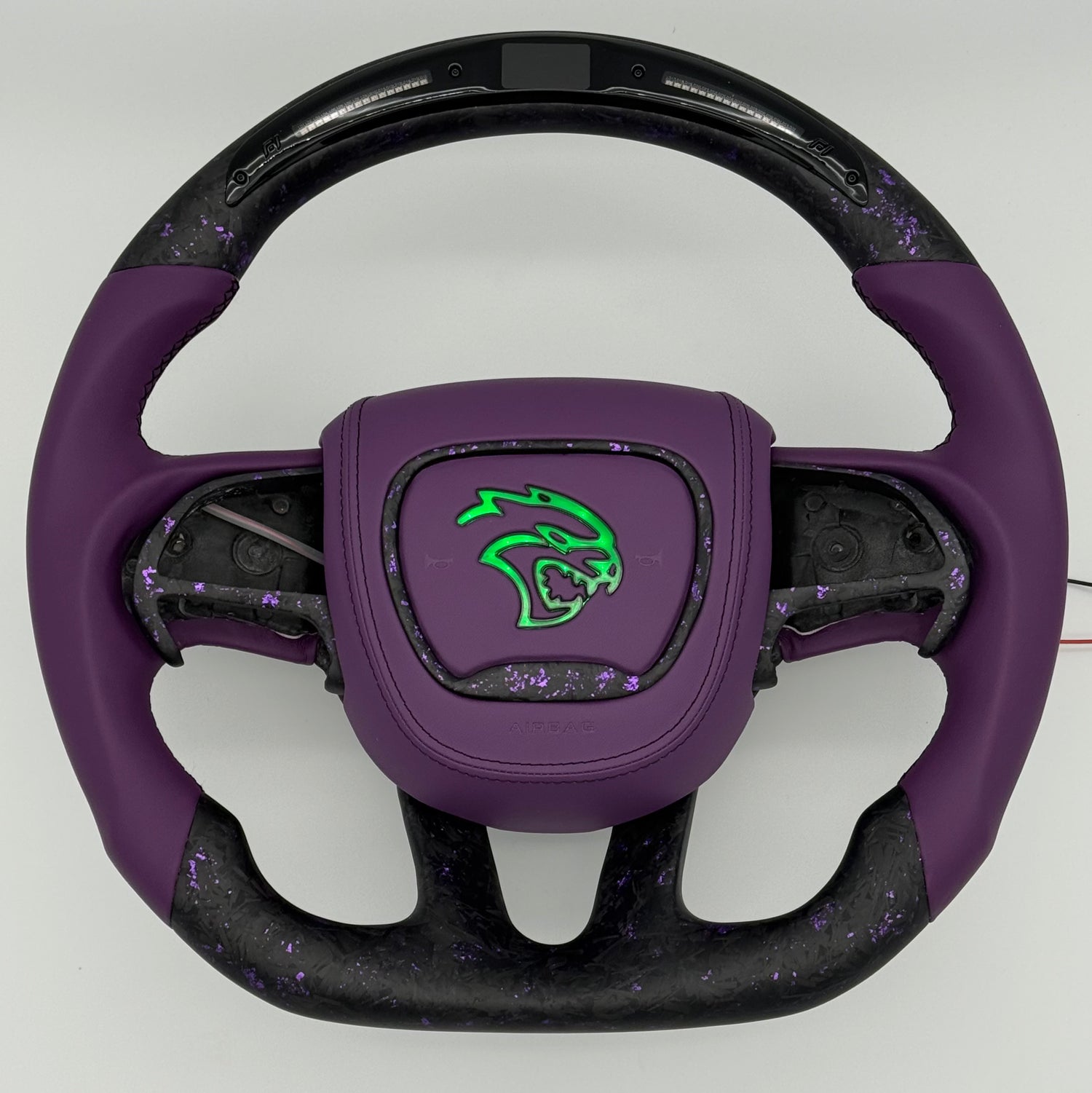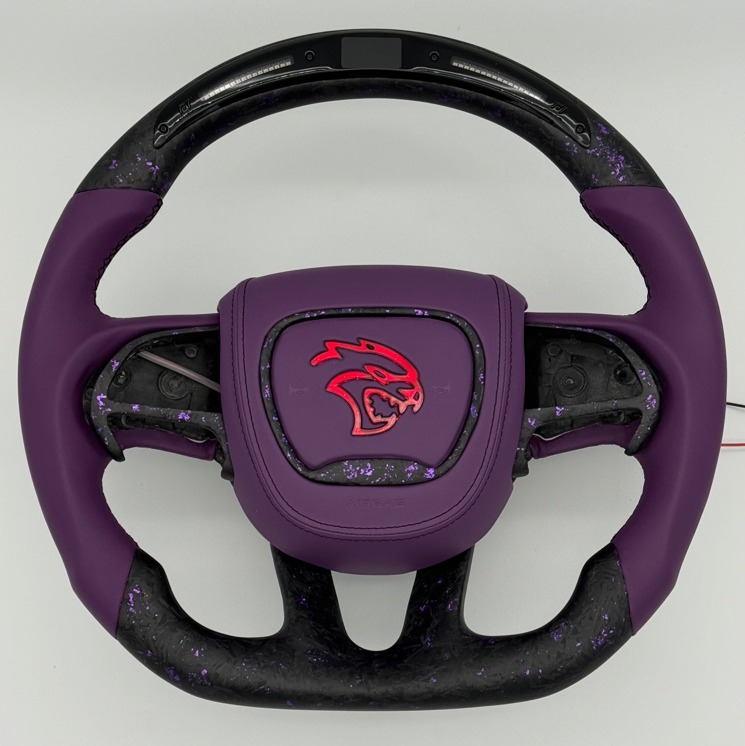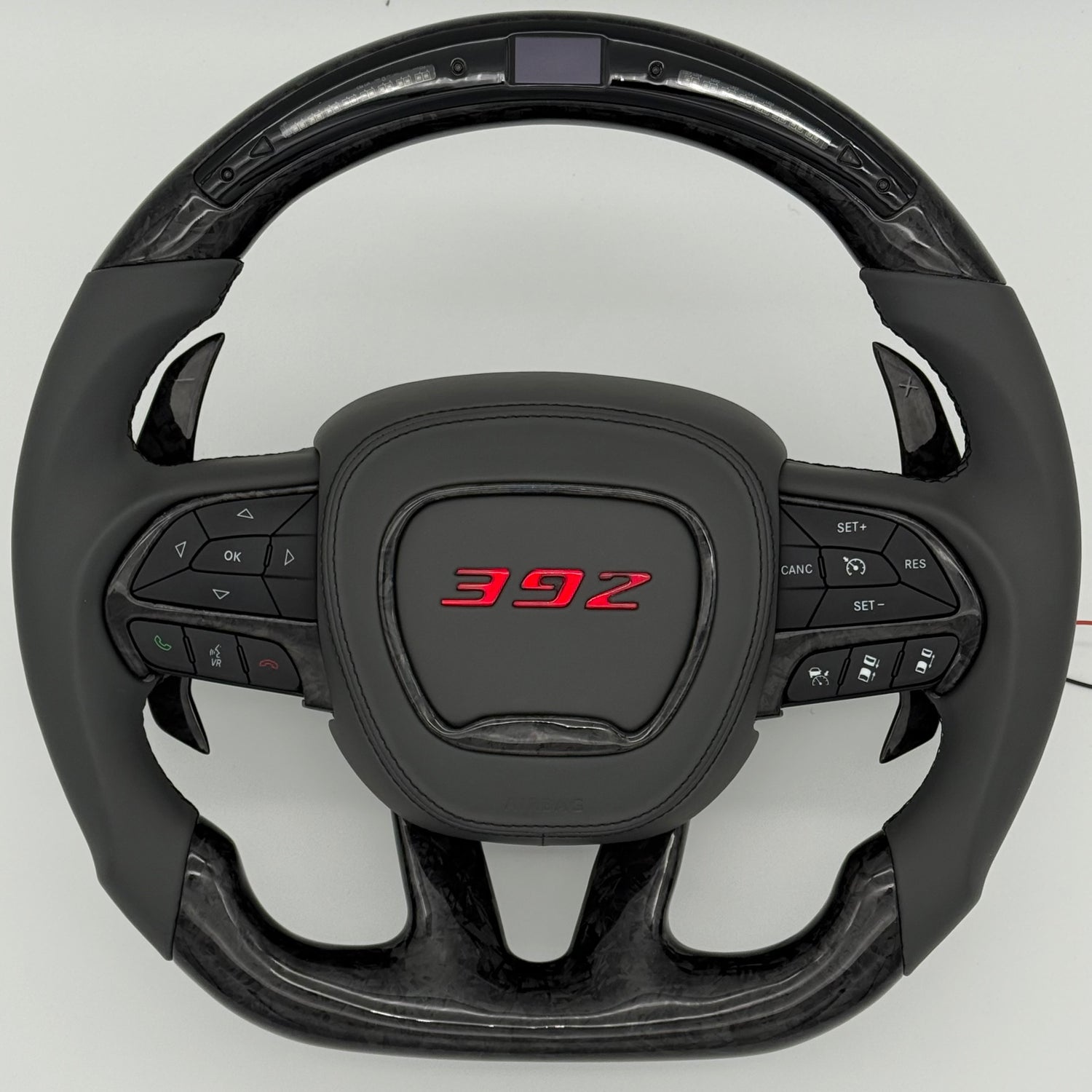 Customizable carbon fiber steering wheel for your 2015-2023 Dodge Charger, Challenger, and Durango use authentic steering wheel cores and are 100% hand built to your specifications! RGB LED Airbag covers available in Hellcat head, SRT, RT, & 392 logos. Choose your main wheel carbon color and finish (matte, gloss, forged (single color or add splattered flakes), honeycomb), wheel shape (round or flat top, bottom), grip material/color (smooth leather, perforated leather, alcantara/suede), stitching color (tri-colored options available), optional carbon thumb inserts in grip (can be different carbon color/finish), 12 o'clock middle stripe color, middle trim carbon finish/color (can be different from wheel carbon color/finish if desired), paddle shifter carbon finish/color, custom airbag cover, heated function, plus more! The LED display features RPM matching shift lights and a middle display that shows a variety of vehicle data gathered from a wireless OBDII module.