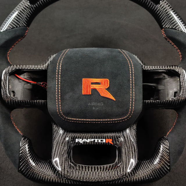 2021-2026 Ford Raptor R airbag cover with: black alcantara, orange stitching, Raptor R logo stitched in orange. We also have the button trim piece in gloss black regular carbon with white/orange Raptor R logo. To install this, you remove your original airbag, remove the cover, then reinstall this airbag cover. This DOES NOT INCLUDE THE AIRBAG ASSEMBLY! Original retail cost of this airbag cover was $250.