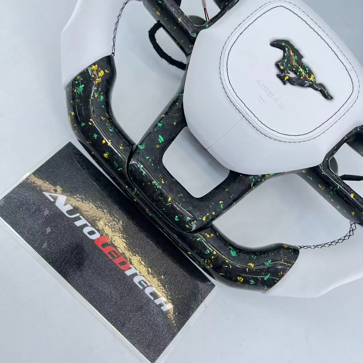 Customizable carbon fiber steering wheels for your 2024+ Ford Mustang S650 (Ecoboost, GT, Darkhorse) use authentic OEM/factory steering wheel cores and are 100% hand built to your specifications! Choose your main wheel carbon color and finish (matte, gloss, forged (Single color or splattered), honeycomb), grip material/color (smooth leather, perforated leather, alcantara), stitching color (some tri-colored options available), optional carbon thumb inserts in grip (can be different carbon color/finish), 12 o'clock middle stripe color, middle trim carbon finish/color (can be different from wheel carbon color/finish if desired), Extended paddle shifter carbon finish/color, custom airbag cover, plus more! The LED display feature RPM matching shift lights and a middle display that shows a variety of vehicle data gathered from a wireless OBDII module.