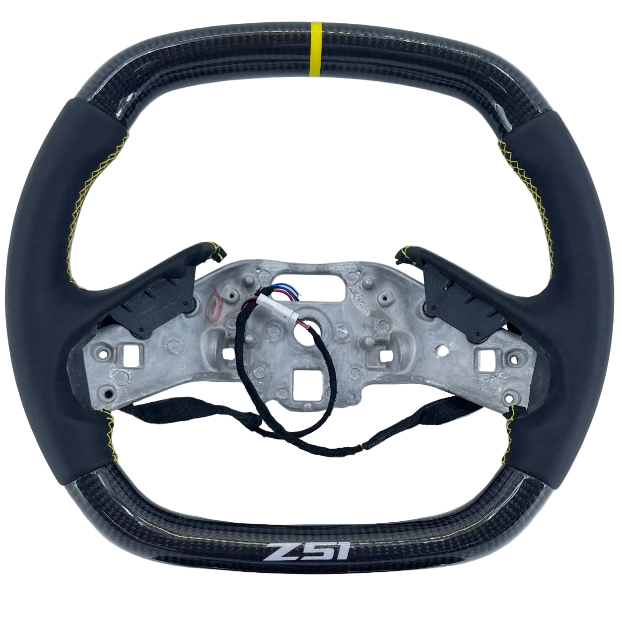 2020-2026+ Chevy C8 Corvette Z51 carbon fiber steering wheel with: gloss finish regular carbon, black smooth leather, yellow stitching, yellow top strip, light grey/silver Z51 logo, heat function, (optional) carbon button trim, (optional) custom airbag cover. Original retail cost of this wheel was $820. You can add on the carbon button/bottom trim with custom logo as well as a customized airbag cover if you would like for an additional cost of ($99/$190, we will contact you after order is placed for customization options)