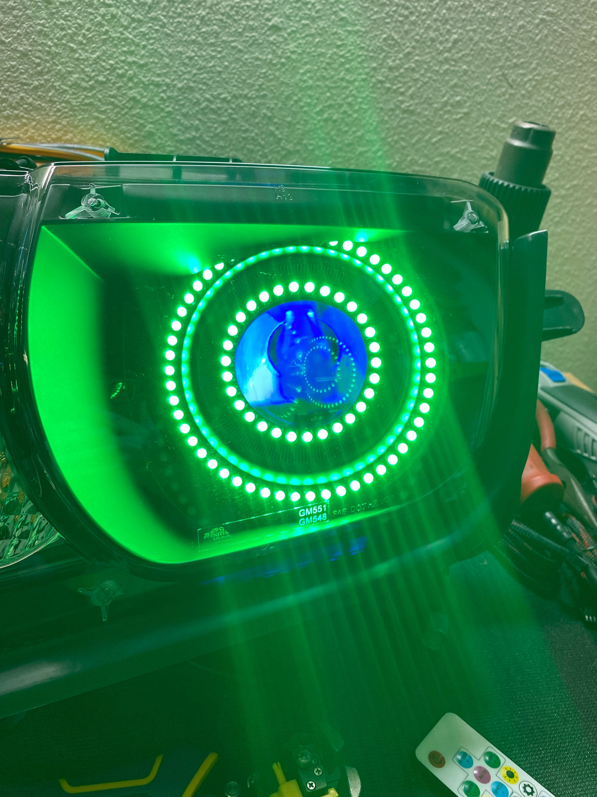 Demon eyes are a small LED light that give the headlight projector lens (where the headlight bulb typically shines out) a glowing effect that can change to any solid color. These are typically controlled separately from your halos/DRLs and DO NOT replace your actual headlight bulbs!