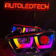 AutoLEDTech.com 's Prebuilt 2011-2014 Dodge Charger Spec-D RGBW Color-Chasing Halo Projector Headlights can change to any solid color, pure white, plus hundreds of moving, flow series patterns! Our prebuilt headlights are your solution to an easy headlight upgrade. These will fit any model 2011-2014 Dodge Charger (SE, SXT, Rallye, RT, SRT8, Super Bee, etc). The original DRL boards are replaced with our custom RGBW Color-Chasing DRL boards that can change to any solid color, PURE white, plus hundreds of moving, color-chasing patterns! Our Sequential Turn Signal/DRL harness can be added to give the DRLs the ability to switch to a sequential amber turn signal as well as a white DRL for driving. Halos can also be installed around the projector if desired. Please contact us if you have any special requests!