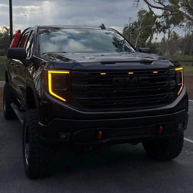 Upgrade the white DRLs in your 2022+ GMC Sierra 1500 (refresh) truck to switchback amber/white DRLs or FULL-TIME AMBER with the plug and play amber LED DRL headlight harness. Installation is as simple as plugging into the back of the headlight, then into the factory headlight harness and retains all factory options. Switchback - During daylight with your automatic headlight controller set to AUTO, the daytime running lights will be amber. At night the running lights will switch back to white automatically to match the headlights and/or fog lights or any other time the parking lights are turned on. You can also manually control your DRLs during the day with the automatic headlight controller. Turning it clockwise to the parking light setting will turn your DRLs white again. We recommend just leaving the knob in the auto position and let the truck do the work for you. With this kit you will maintain sequential turn signals that your truck came factory with.