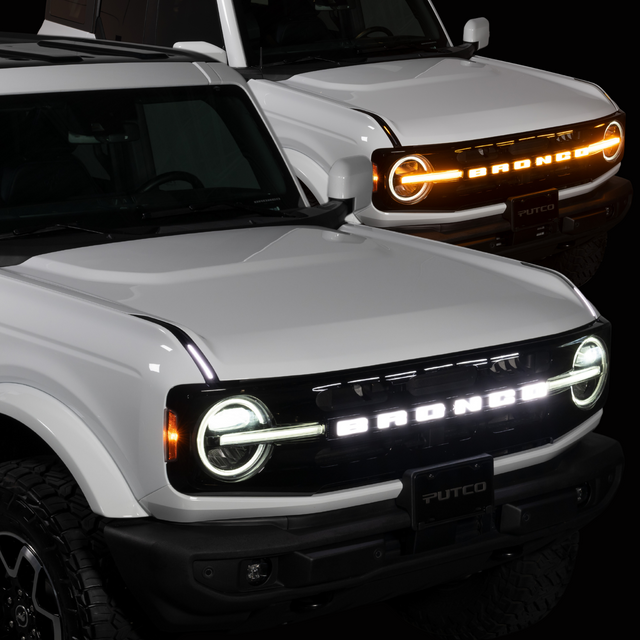 Putco Luminix illuminated white & amber LED BRONCO grill emblem fits any model 2021-2026+ Ford Bronco (all trim levels, sport, camera/no camera) and can switch between white or amber/orange LEDs. Installation and wiring is a breeze as well; simply remove your grill, remove the original emblem, install the new emblem, then reinstall the grill and use the included plug & play wiring harness to tap into the headlight wiring that will turn the emblem on and off with the ignition. Thats it! The harness has a switch to change the emblem between white and amber/orange LEDs.
